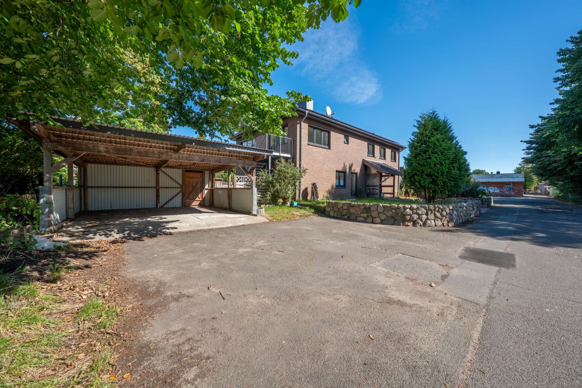 Auch außen zeigt sich die Großzügigkeit. Links des Hauses befindet sich ein Doppelcarport mit Schuppenanbau, rechts eine Garage mit seitlich öffnendem Tor – ideal auch für Camper oder Wohnmobile. Der Garten vereint eine grüne Wiese zum Spielen, eine großzügige Terrasse, die wie ein Podest über den Anbauten liegt, sowie einen malerischen Teich, umrahmt von Stauden und Sträuchern. Ein Platz, der Ruhe schenkt und gleichzeitig zum geselligen Beisammensein einlädt.
